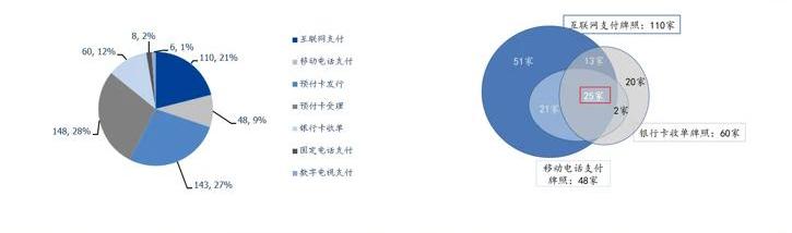 牌照發放與監管日趨嚴格。2011年到2015年,央行一共發放了270張第三方支付牌照,其中,2015年僅發放了2張。2015年8月,央行注銷了3張支付牌照,結束了第三方支付牌照“只發不撤”的歷史。2016年4月,央行下發文件對支付機構分級分類監管,且5年期滿之后續展從嚴。根據央行官網,截至2019年4月底,市面上剩余237家持牌支付機構正常運營,共擁有523張支付牌照。其中,“預付卡受理”148張,“預付卡發行”143張,兩者占比超過50%;其次,“互聯網支付”牌照共110張,占比21%;“銀行卡收單”牌照共60張,占12%。