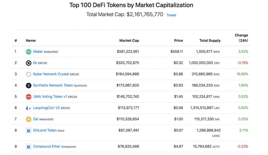 來源:DeFiMarketCap上述統計中包含566種代幣,市值共計21.6億美元,市值排名前列分別是:MKR、ZRX、SNX、KNC、UMA、DAI等。從這些代幣市值看:1)Maker協議相關資產總值超過5.5億美元,占DeFi總市值25%以上;2)0x協議市值3.22億美元,Synthetix市值1.72億美元;3)排名中160以后的代幣市值就不超過10萬美元了。那10億變20億,是怎么來的呢?DeFi,幾周漲10億美金,錢從哪來?