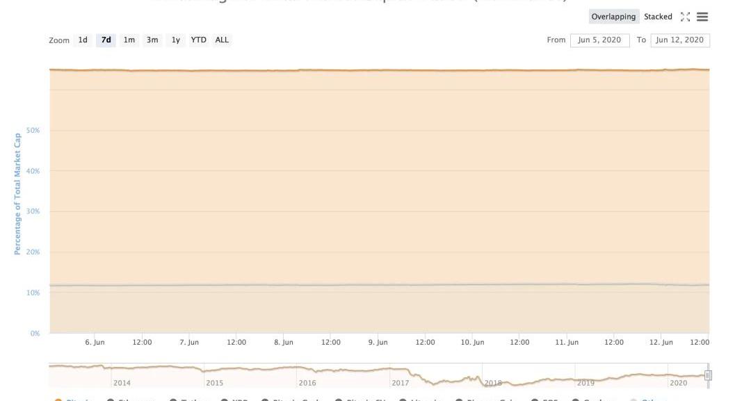 根據CoinMarketCap數據,BTC近7日日均換手率為12.65%,較三個月內日均換手率下降了14.44%,較上周日均換手率下降3.08%。BTC處于高位震蕩,但成交量方面卻一直處于低迷狀態,在6月11日BTC再次試探$10,000壓力位,但成交量未能形成有效配合,之后受美股指數的閃崩拖累,BTC也短暫較大程度下跌,跌幅一度近10%。BTC成交額不足成為上漲最大阻力,短期壓力凸顯,預計將下跌蓄力之后再次上漲,支撐位在$8,500。