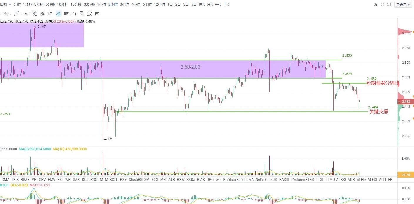 各級別性質:日線-下跌,4小時-盤整,1小時-下跌截圖來自OKEXEOS季度2小時圖:目前的客觀走勢及應對策略:EOS同樣跟隨BTC運行,目前在2.4支撐附近暫時止跌,也不要對反彈空間預期過高。上方阻力可先關注2.53一線,最重要的是2.63一線,該價位作為短期走勢強弱分界線,在價格沒有站穩該價位前以逢高空為主要操作思路。相比于BTC和ETH,EOS喜歡跟跌不跟漲,所以在操作的時候,如果有做多的機會出現,那最好去做BTC或者ETH,當出現做空的機會時,EOS或許是更好的選擇。主觀預期:周五晚評的預期同樣完美兌現。接下來認為幣價在小幅反彈至2.53-2.56附近區域后逐步震蕩回落。本段不作為交易策略參考。阻力與支撐阻力:2.55--2.63--2.68支撐:2.40--2.30--2.22