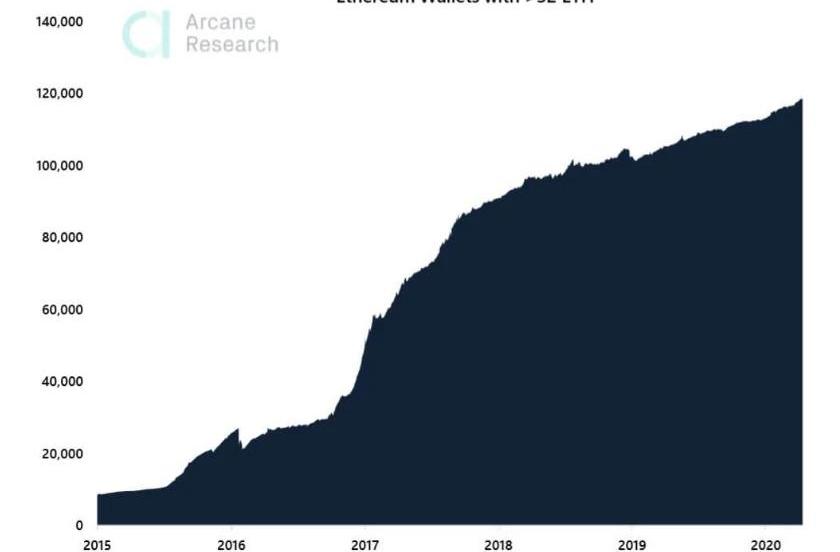 之所以以太坊被投資者看多,最重要的原因是以太坊2.0即將落地。我們都知道,以太坊的最終目的是要成為世界計算機。夢想是偉大的,但和以太坊每秒15筆交易的處理速度相比,則顯得有點天方夜譚。今年5月,V神在推特上表示,他對2014年推出以太坊感到遺憾,因為有許多錯誤必須修復。事實上,盡管以太坊在推出之后,憑借lCO成功占據加密貨幣領域的第二把交椅,但一直以來,以太坊因為擁堵和低效等性能問題而飽受詬病。也正因此,在以太坊的既定升級計劃中,最終將會拋棄PoW,轉向PoS的懷抱。而這就是以太坊2.0。“和EOS21個節點的高度中心化不同,以太坊屆時開放的節點數量將高達100萬個。”以太坊無畏社區發起人宋無畏告訴DeepChain深鏈。在以太坊2.0中,驗證節點通過將資金存入以太坊基金會開發的官方存款合約。驗證者將下載并運行以太坊2.0客戶端軟件,并在運行客戶端軟件的同時,將被隨機抽中在鏈上打包或驗證區塊。正確打包并驗證區塊的驗證者將獲得以太坊作為獎勵。根據ArcaneResearch的最新數據,截至目前,擁有超過32個ETH以太坊的錢包數量穩步增長,目前有近12萬個地址有資格成為驗證者。