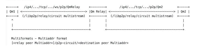 圖:兩個網絡節點的Relay協議,通過Multiformats的Multiaddr自描述地址對傳輸的地址進行解釋當眾多網絡節點依附于各種不一樣的NAT路由和服務器平臺時,節點們是不允許外部的連接接入的。如果必須要把這些節點連接起來形成一個去中心化的網絡環境,Libp2p的Relay協議就把proxy設置在并生成連接于任意兩個節點之間:這樣所有的信息傳輸都會被加密并由遠端的多數節點進行驗證,因此使proxy本身無法成為驗證中間人但仍擔任傳輸中繼的角色。