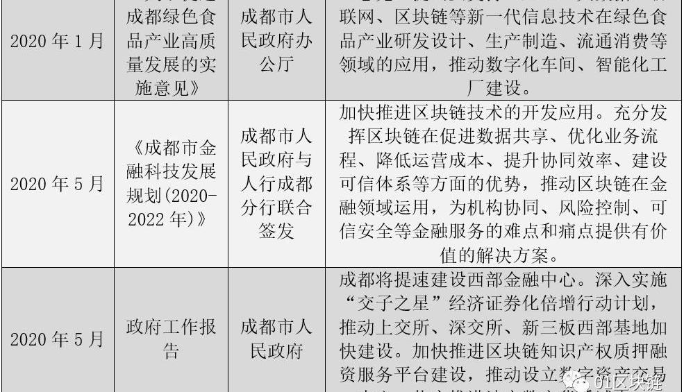 作為國家西部金融中心,金融科技被視為主要的突破口。成都市區塊鏈產業的發展,前期也主要以金融成為主要的落地行業。回看成都推出的與區塊鏈相關的政策,多與發展金融、金融科技產業相關。尤為值得關注的是,在2020年5月成都市人民政府與人行成都分行聯合簽發《成都市金融科技發展規劃(2020-2022年)》,這是全國首個由地方政府和人民銀行共同發布實施的金融科技發展規劃。在這份規劃中,加入了大量有關區塊鏈的內容,著重規劃了區塊鏈在金融場景中的應用。01區塊鏈·零壹智庫統計發現,規劃中,“區塊鏈”這一關鍵詞出現了17次。在第二章《發展重點》的第一部分“加大金融科技核心技術的研發與應用”中,區塊鏈技術被放在人工智能、大數據、云計算等新一代信息技術的首位。規劃內容提到“加快推進區塊鏈技術的開發應用。充分發揮區塊鏈在促進數據共享、優化業務流程、降低運營成本、提升協同效率、建設可信體系等方面的優勢,推動區塊鏈在金融領域運用,為機構協同、風險控制、可信安全等金融服務的難點和痛點提供有價值的解決方案。”在應用場景方面提到:探索區塊鏈、大數據等技術在深化庫銀稅合作、數字票據、融資對接等金融領域的應用。……通過基于區塊鏈技術的知識產權融資服務平臺,為企業提供具有高誠信、高效率、低成本的融資服務,促進知識產權安全高效地轉移轉化,切實提高金融服務實體經濟的能力。……運用區塊鏈、物聯網、人工智能等技術手段,將供應鏈各方鏈通,實現貿易數據的互信互認。探索將國家外匯管理局跨境金融區塊鏈服務平臺應用于航空金融服務,緩解中小企業融資難問題。其中,除了前文所述的區塊鏈知識產權融資服務平臺外,成都市在區塊鏈與供應鏈金融的結合方面也著力不小。2017年12月成都市人民政府辦公廳印發《關于推進普惠金融發展的實施意見》,在推進普惠金融機構和市場體系建設中提到:積極發展供應鏈金融。充分利用區塊鏈技術公開透明、不可篡改的屬性,支持區塊鏈在跨境支付、保險理賠、票據管理等金融領域的典型應用,為供應鏈管理企業提供高效便捷的融資渠道。 2019年12月,成都市人民政府辦公廳《精準支持現代供應鏈體系發展政策措施》中提到,鼓勵發展基于物聯網、大數據、云計算、5G、區塊鏈等新技術運用的供應鏈新模式。三、企業集聚帶動,技術應用見成效