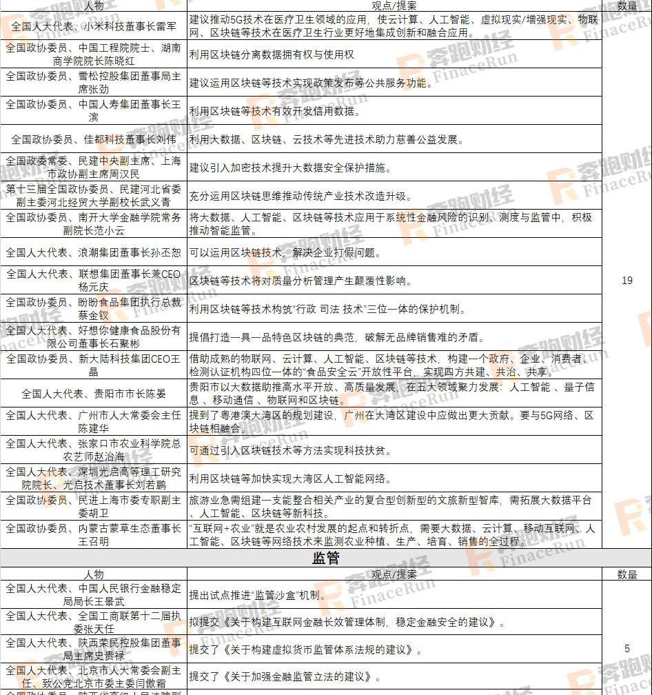 2018年:熱詞94之后,國內區塊鏈行業遭遇了嚴峻監管,1CO遭遇嚴打,眾多區塊鏈公司、企業紛紛逃離出海。2018年,迎來區塊鏈元年,區塊鏈技術已然被越來越重視起來。BAT爭先開始區塊鏈產業的布局,人民日報也在2018年兩會前夕刊發了三篇整版的區塊鏈文章。在之后的兩會,企業家代表、政協委員以及人大代表紛紛就“區塊鏈”發表了相關看法,主要從區塊鏈在技術、應用以及監管的三個角度進行了熱議,其中,關于區塊鏈行業的監管問題被更多的提到。奔跑財經就觀點進行了總結: