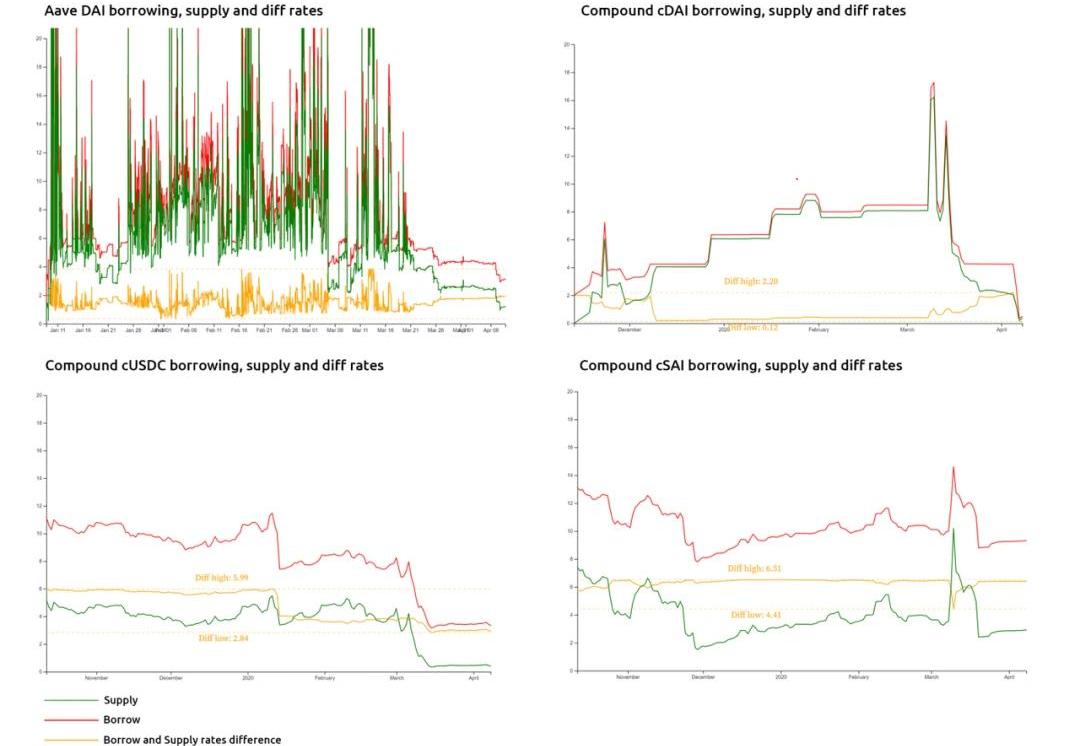 做市商的預期收益=5%-3%+浮動存款率-浮動貸款率=0.2%-做市商收益計算-事實上,做市商的收益根據市場情況在0.2%至5%之間徘徊。根據統計情況來看,存款利率和貸款利率之間的利率差很穩定: