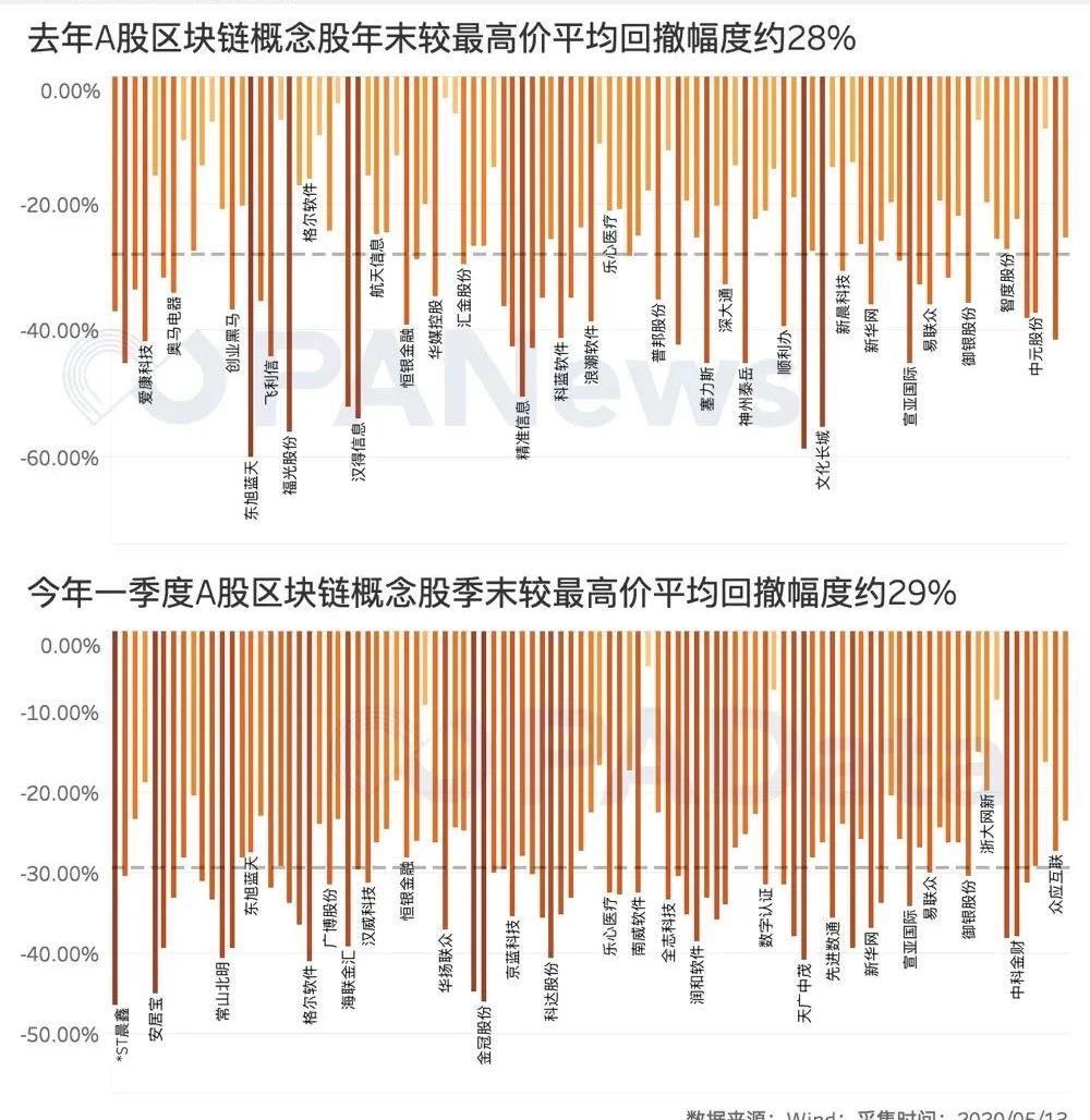 但受到整體經濟環境的影響,今年一季度區塊鏈概念股的平均日均漲幅由漲轉跌,日均跌幅約為0.08%,99只概念股中僅35只日均漲幅為正,其余64只均為負。其中,深科技、浪潮信息和用友網絡是今年一季度日均漲幅最高的三只概念股,均超過了0.7%。去年年末較去年最高股價的平均回撤幅度約為28%,今年一季度末較一季度最高股價的平均回撤幅度約為29%,兩者基本相當。