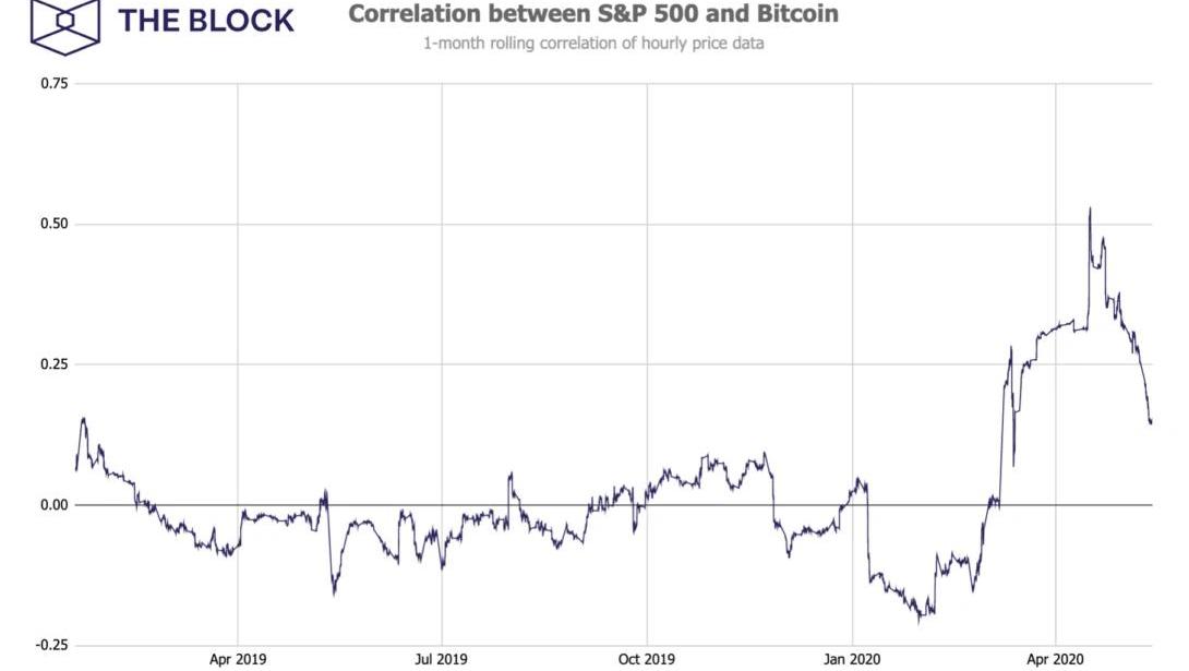 5月12日比特幣減半后,幣價出現小幅下跌,出人意料的是這種下跌趨勢并未持續。根據OKEx現貨價格數據,到5月14日,幣價快速回升觸及9900美元,實現三日內15%的漲幅,之后,比特幣價格表現出穩健走勢,上周實現10.36%的漲幅,之后價格基本維持在9500美元以上。至此,比特幣價格收復3.12暴跌帶來的失地,幣價重現年初“小牛”跡象,某行業從業者曾表示“世界上沒有哪種資產在價格縮水近一半后能在短期內迅速恢復,除了比特幣”。較為穩健的幣價以及基本穩定的全網算力鞏固了投資者信心,對于減半后半年至一年內幣價走高的預判推動了市場看多情緒。根據Decrypt報道,比特幣交易額在5月18日達到25億美元,為今年以來新高;OKEx數據顯示,比特幣期貨保持對現貨溢價狀態。在新冠影響下的“反全球化”和經濟下行趨勢中,比特幣相對于傳統股票市場表現出更強的抵抗力和獨立性。比特幣價格表現越來越向避險資產黃金傾斜;外媒TheBlock報道稱,比特幣與S&P500相關性從4月16日的0.53降低至5月14日的0.15,相關性數值接近于0意味著比特幣相對于股市走出獨立行情。