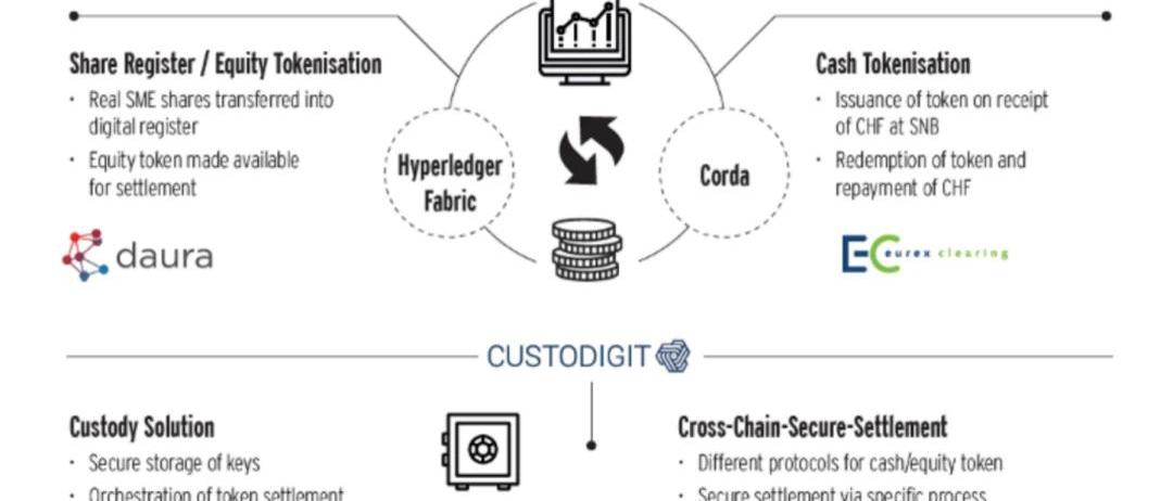 Blockbaster計劃2016年開始,德國央行、德意志銀行與德意志交易所開始試驗Blockbaster計劃。Blockbaster計劃建立在由DigitalAsset(DA)開發的區塊鏈平臺上。平臺底層架構為HyperlegerFabric。Blockbaster計劃有三個研究目標:一是研究基于區塊鏈轉賬的可行性與可靠度。二是研究基于區塊鏈清算機制的成本。三是評估基于區塊鏈的金融交易效率。研究內容包含三個:一是試驗區塊鏈證券發行、結算和贖回的整個歷程,二是資金移轉,三是資金結算。試驗涵蓋1000個使用者、500檔證券以及20萬筆交易。其中20萬筆交易被拆成三類:DvPs(券款兌付)、FoPs(純券過戶)以及現金交易。試驗證明了基于區塊鏈的金融后交易后處理的邏輯性足夠且具備可行性。該試驗花費35分鐘完成這些交易,平均每秒交易吞吐量為95個交易請求,且交易間隔在2毫秒內,鏈上清算效率足夠。Blockbaster試驗歸納出基于區塊鏈的清算系統有幾個缺點:第一是交易沖突。試驗中有一定量的交易沖突但是在可接受范圍內,交易沖突主要發生在DvPs以及現金交易中。第二是系統耗能高。基于區塊鏈的清算系統會造成高CPU使用率以及經常性的系統延遲。DauraDaura是一個證券代幣化平臺,由瑞士電信創立。2019年底,Daura、德意志交易所及歐洲期貨交易所成功試驗基于區塊鏈的金融交易后服務。該次試驗存在三方角色。歐洲期貨交易所為付款方,并利用Corda平臺進行資金Token化。歐洲期貨交易所向瑞士國家銀行(SwissNationalBank)下的Token賬戶轉入資金(瑞士法郎),觸發Corda平臺發行等量Token化資金至歐洲期貨交易所Token地址。FalconPrivateBank為首的三家銀行為付券方,利用Daura平臺將證券Token化。證券Token化過程符合存托憑證發行過程,Daura平臺則為存托機構的角色。Custodigit為托管機構,提供安全解決方案及秘鑰托管的服務。該次試驗付券端和付款端使用兩種不同的區塊鏈體系,屬于跨賬本DvP。該試驗利用「跨鏈安全結算」進行逐步結算,確保結算過程保持原子性。