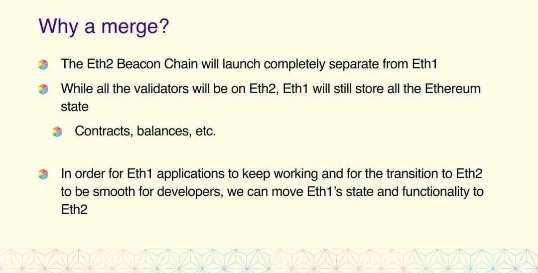 該部分陳述了需要合并Eth1和Eth2的原因:為使Eth1的應用能繼續工作,要把Eth1的狀態和功能都遷移到Eth2系統中;然后介紹了合并所涉及的三個步驟:無狀態Eth1、Eth2的Phase0和Phase1;然后是形成合并規范。下文也根據這三個步驟分別展開。