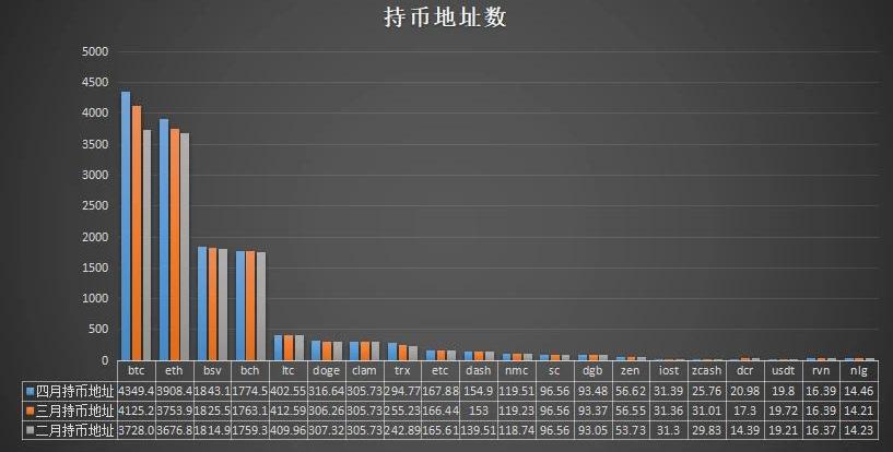比特幣在四月底的持幣地址數達到4349.43萬,較三月上漲5.43%;以太坊的持幣地址數則達到3908.48萬,較三月上升了4.11%。而通過比較近三個月的持幣地址數變化詳情,我們可以更明確的判斷項目的發展情況。