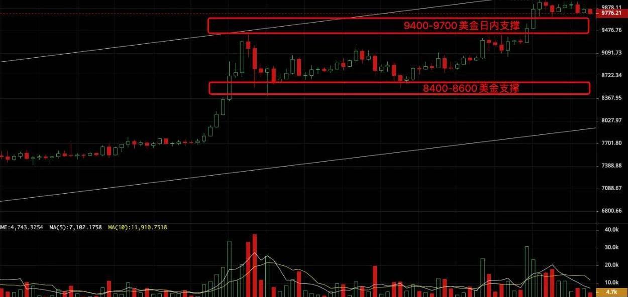 理論上講,減半時間正式來臨后存在利好變利空的回調預期,參考4月份的減半幣種BCH、BSV和DASH,在減半后均有不小的回撤。此次BTC減半,也存在這樣的回撤預期。難點在于回撤什么時候會來臨?回撤的幅度有多大?因為這涉及到短線操作上的問題。我們暫且以9400-9700美金區間為日內行情的回撤區間,回撤不破此區間,行情依舊是多頭主導格局,并有較大概率繼續上行;以8400-8600美金區間為多空勢能的臨界點,跌破后空頭才占據主導低位,后續可能形成下跌中繼走勢。