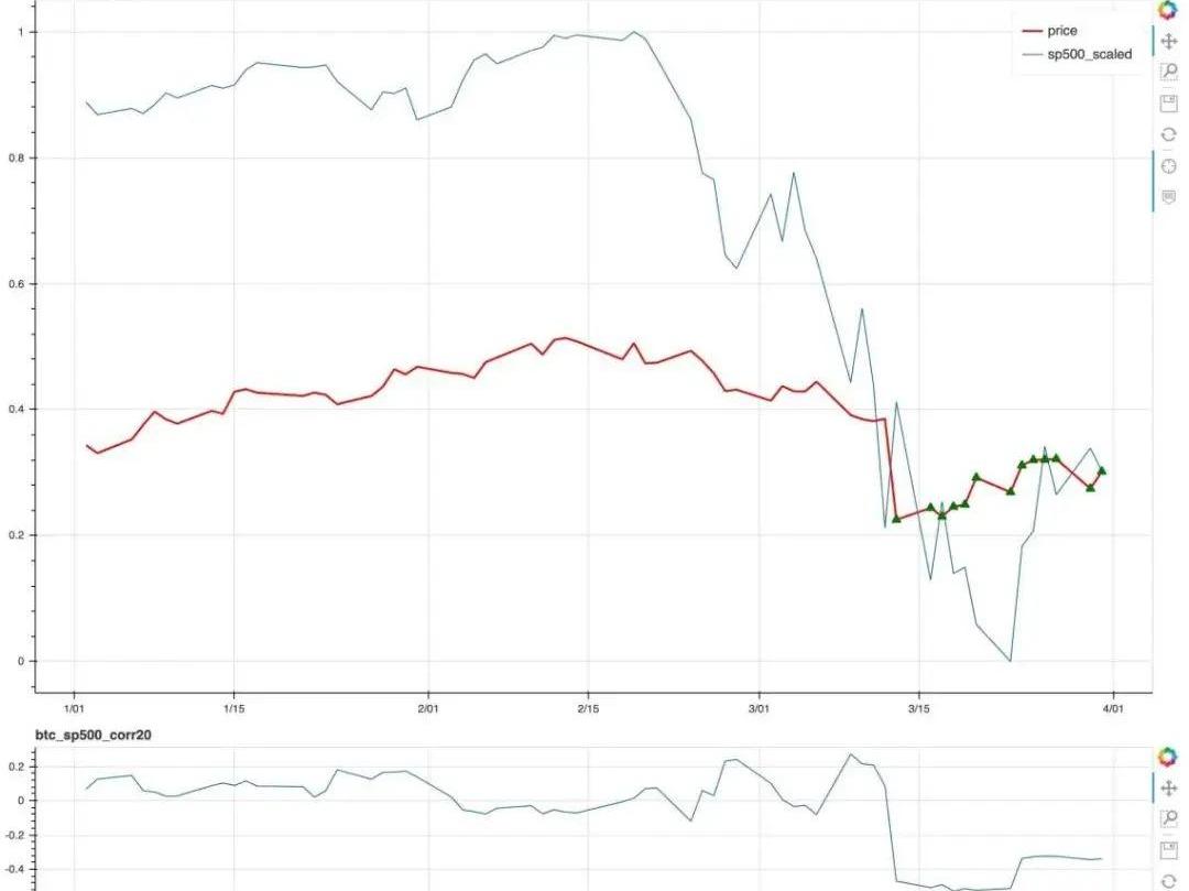 圖片說明:代表5種資產價格下跌的直方圖(2020年2月-2020年3月)對資產進行相關分析下面四個圖表顯示了這四種資產與比特幣的相關性。圖中的價格是按比特幣價格計算的。圖中的綠色三角形表示相關系數小于-0.3的時刻(金色除外)。換句話說,綠點是兩個價格可能反向移動的點。例如,如果美元價格下降,BTC價格上升。在所有對中,BTC-USD的相關性分析將給我們最有意義的見解,因為USD是在冠狀病爆發期間最穩定的資產。因此,如果BTC與USD始終具有較強的相關性,則可能表明在冠狀病大流行中,比特幣被認為是一種安全的資產(黃金也是如此)。以下是2020年2月至3月20天滾動相關數據