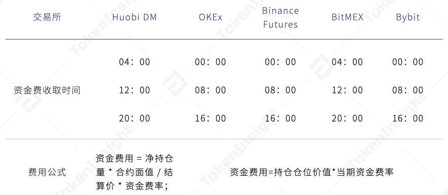 主要交易所永續合約風控機制,來源:TokenInsight然機制各有不同,但是市場上的風控機制大同小異。HuobiDM采取最高5檔階梯強平機制,確保觸發強平的用戶不會一次性爆倉,極大規避了市場普通強平風險,并用指數移動平均線EMA作為強平時的另一個參考值,避免可能會因為幾筆異常的價格而造成用戶強平并引發的連環強平風險。階梯強平制度和OKEx采取的階梯維持保證金率制度,都可以防止大倉位爆倉時對市場流動性造成沖擊,產生大的穿倉損失。2.2資金費用對比永續合約不同于交割合約,永續合約沒有到期或交割,所以會有現貨與合約的價格大幅度偏離,需要通過“資金費用機制”來讓合約價格錨定現貨價格。當資金費率是正的,多頭支付空頭。當資金費率是負的,空頭支付多頭。資金費用完全在用戶之間進行結算,交易所不會從中收取任何費用。