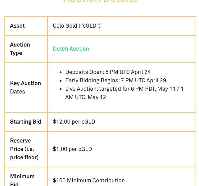 12小時的競價拍賣結束,Celo在5月12日通過Coinlist完成了其代幣CeloGold的首次荷蘭拍,共籌資1000萬美元,每枚cGLD起拍價12美元,最終結算價為1美元。