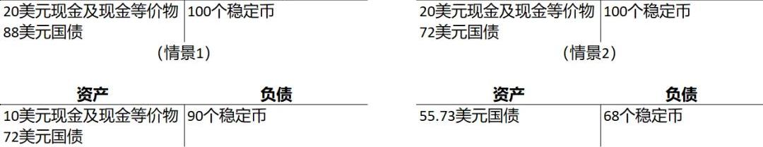在穩定幣框架下,Libra1.0和2.0提出了兩種不同的超主權貨幣方案。要理解這兩個方案,需要先理解單一貨幣穩定幣的風險和監管問題。單一貨幣穩定幣的風險和監督單一貨幣穩定幣在經濟學設計上非常簡單:一個中心化受信任主體基于法幣1:1發行數字憑證,在數字憑證贖回時按1:1兌現法幣,并保證法幣儲備不低于數字憑證總發行量,為此需要定期接受獨立審計并披露信息。在這些規則的約束下,數字憑證就是穩定幣,數字憑證代表法幣,數字憑證流轉代表法幣交易。問題在于:第一,穩定幣的法幣儲備不會完全以現金形式存在,而是會部分投資于低風險證券。證券投資有收益,也伴隨著風險。一旦證券投資虧損,法幣儲備就可能不充足。這對穩定幣的價值有什么影響?穩定幣的持有者會如何應對?第二,即使法幣儲備中證券投資沒有虧損,如果穩定幣持有者集中、大額贖回,穩定幣發行者能否應對贖回?需要看到的是,任何證券的市場流動性都是有限的,出售證券不可能不耗時、無損失地換回現金。可以對穩定幣引入三個概念來分析上述問題。第一,面值。面值等于1。第二,如果所有穩定幣持有者共同享有法幣儲備的所有權,1單位穩定幣的內涵價值等于法幣儲備市值除以穩定幣發行量。顯然,法幣儲備充足等價于內涵價值不低于1。第三,市場價格。穩定幣進入流通后,市場價格受供需因素影響,可以偏離面值和內涵價值。接下來用一個簡化數值例子來說明這3個概念。假設T=0時刻,穩定幣發行者收到100美元,對外發行100個美元穩定幣,并將法幣儲備中80美元投資于國債,20美元以現金及現金等價物方式存放。到T=1時刻,假設國債投資有-10%和10%兩種可能的收益率,分別稱為情景1和情景2。在這兩種情景下,穩定幣的內涵價值分別為1.08美元和0.92美元。