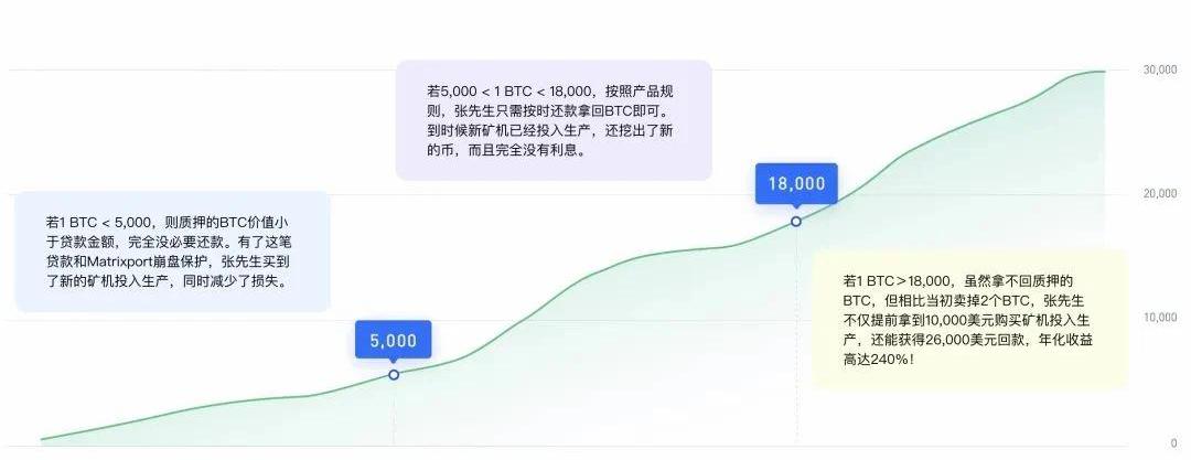 該產品主要宣傳點是:零息借貸、永不爆倉、崩盤保護、靈活定制。簡單來說該產品為借款人提供借款不收利息,但在到期還款時約定了一些限定條件。我們以官方公布的案例做分析。