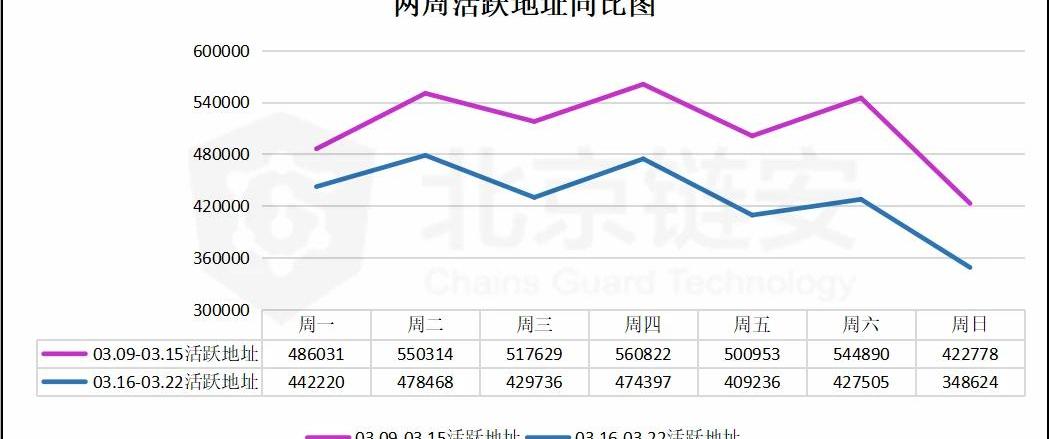 活躍地址數:03.09-03.15:358341703.16-03.22:3010186較之前一周下降:16.00%詳細數據圖如下: