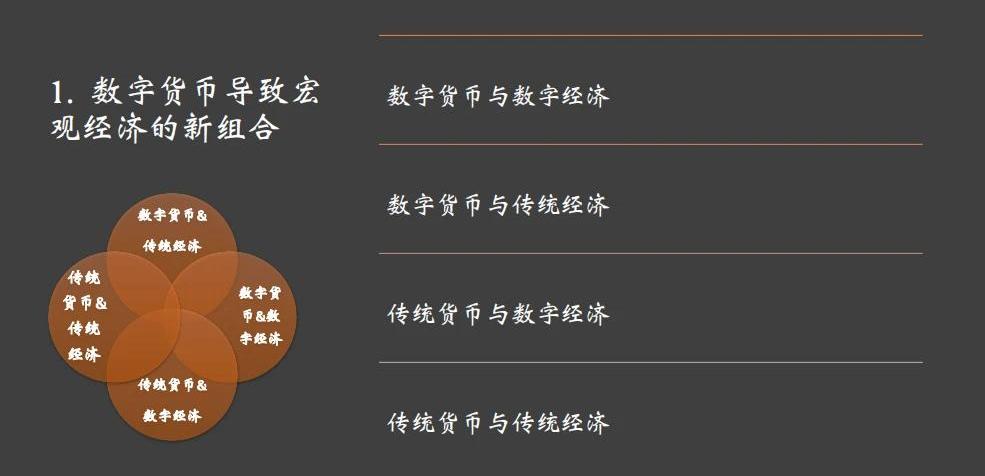 首先,因為數字貨幣和數字經濟的產生和發展,導致了貨幣經濟和宏觀經濟結構發生變化。因為有了數字貨幣,貨幣體系發生結構性變化,有了傳統貨幣和數字貨幣的分類;因為數字經濟,宏觀經濟同樣發生了結構性變化,有了傳統經濟和數字經濟的分類。于是,貨幣經濟與宏觀經濟的組合與宏觀經濟之間形成了前所未有的重新組合。這里畫了一個圖,分了四個類型,一是數字貨幣與數字經濟,二是數字貨幣與傳統經濟,三是傳統貨幣與數字經濟,四是傳統貨幣與傳統經濟。