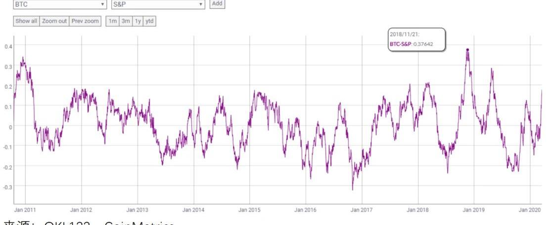 過去十年間,比特幣和黃金的90日相關系數大都在0.1至-0.1之間,極少時期會超出-0.3或0.3的范圍。也就說大部分時間內,比特幣和黃金的關聯性非常小。但是,從趨勢上來看,2018年之后,比特幣和黃金的正向關聯明顯增多,且有相當一部分時期,二者的相關系數在0.1以上。聯想到2019年底中東局勢緊張加劇時,黃金和比特幣的聯動表現,可以說比特幣作為“數字黃金”,在某些特定條件下有避險表現。二、比特幣與股市的關聯表現