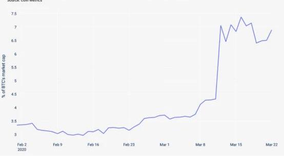 在COVID-19對全球市場的影響開始顯現之時,CoinMetrics觀測到所有的穩定幣供應量增加。并且在BTC大幅下跌之后,穩定幣的供應量似乎也是有所增加的。