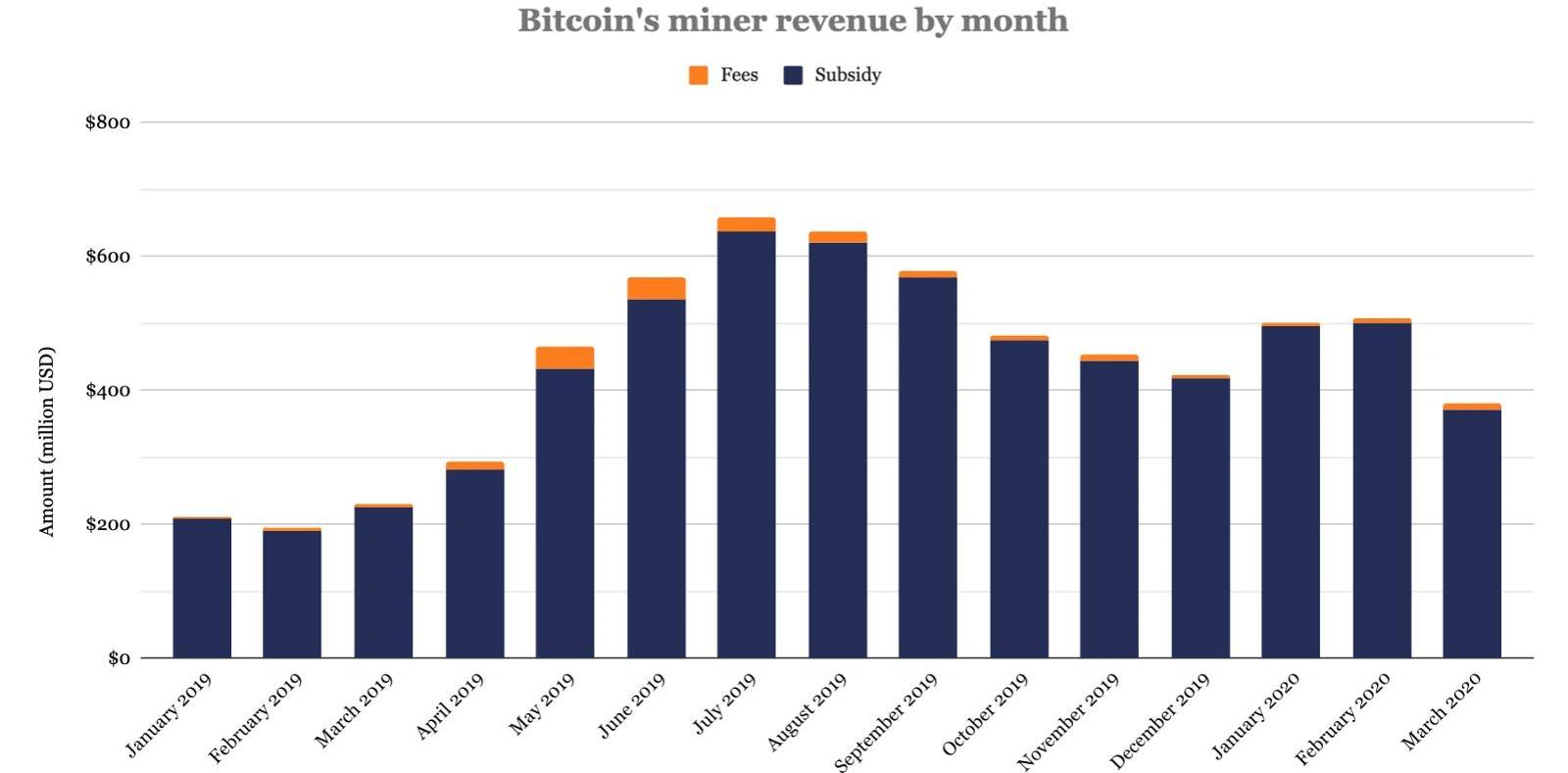 來源:CoinMarketCap,CoinMetric,TheBlock正如TheBlock分析師LarryCermak在3月份的數據總結中指出的那樣,比特幣礦工收入的絕大部分是以區塊獎勵補貼的形式獲得的,目前,比特幣區塊獎勵為每區塊12.5個BTC。如果在預計下個月發生的減半事件之后,區塊獎勵補貼將發生減半,該數字將降至6.25個BTC。簡單來說,比特幣每21萬個區塊的獎勵減半,大約每四年經歷一次,歷史上曾經有過2次減半,分別是2012年和2016年。比特幣的總供應量為2100萬枚,而下一次減半的區塊高度為630,000,預期時間在2020年5月14日前后。這將意味著比特幣礦工能夠獲得的比特幣獎勵數量將大幅下跌,如果比特幣價格無法大幅上漲,這樣意味著礦工美元計價收入將大幅下跌。比特幣礦工在挖礦活動中除了獲得區塊獎勵之外,另一份收入就是交易手續費。交易手續費——由比特幣網絡用戶在交易時支付——目前約占礦工總收入的2.12%。正如TheBlock先前報道的那樣,比特幣礦工在2019年的收入估計為50億美元。50億美元的數字與2018年的水平相比有所下降,當時礦工帶來了52.6億美元的收入。比特幣5月份減半發生之后,礦工能夠獲得的比特幣獎勵將大幅下跌,如果要維持2020年的款共收入,那么比特幣的價格必須與現在相比大幅上漲。