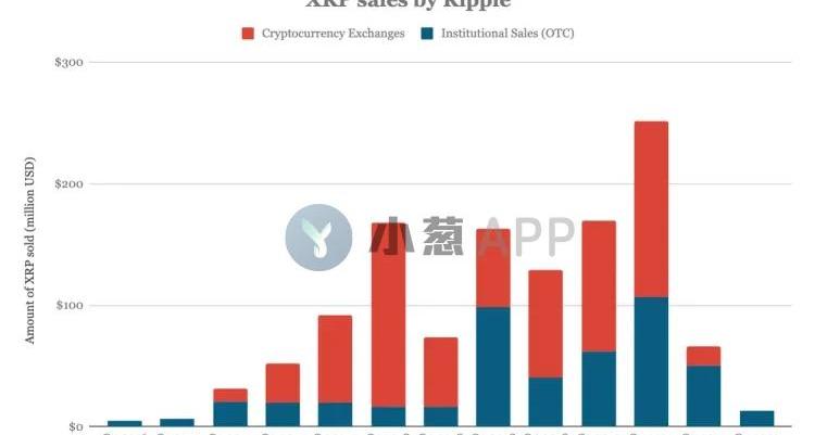 除了將托管資金分散到不同的賬戶之外,Ripple還確保每個月最多托管10億XRP。這適用于Ripple創建的任何新的托管賬戶。目前,最后一個托管賬戶將在2024年5月結束。從2020年4月開始,直到2024年4月,每個月總共有10億XRP的托管會結束。Ripple的XRP銷售就銷售而言,Ripple一直非常透明。它每個季度會發布一個報告,該報告準確顯示了該時間段內XRP的銷售量。如下圖所示,從2018年第三季度到2019年第二季度,Ripple的銷售額最高。