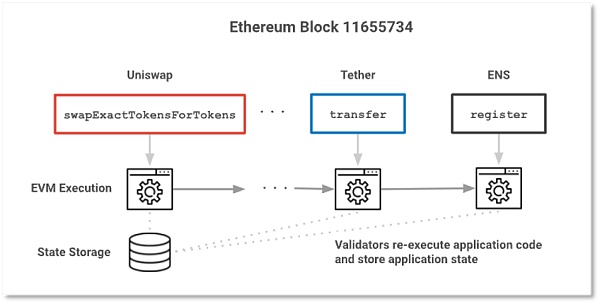 現有鏈中,開發人員在虛擬機(如 EVM)上以字節碼運行應用程序,驗證者通過與虛擬機中的應用程序相關聯的字節碼來執行交易等事務。此模型下,訪問和更新應用程序后,驗證者必須重新執行復雜的計算,這限制了應用程序的復雜性,還增加了成本。