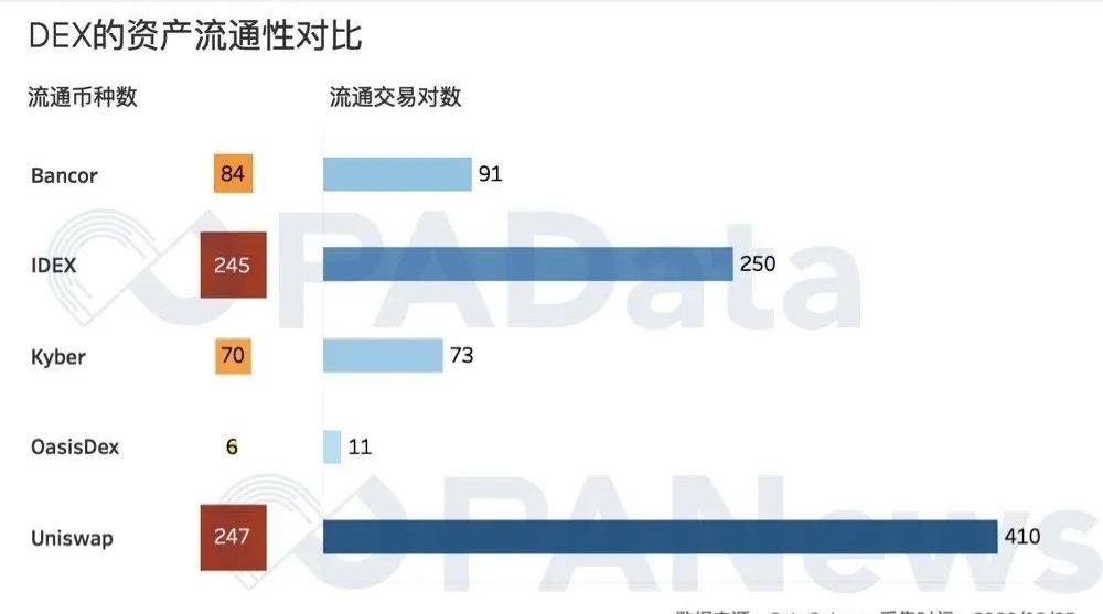 去中心化交易所主要根植于Ethereum公鏈,其上流通的資產以ERC20通證和以太坊為主。PAData統計了Bancor、IDEX、Kyber、OasisDEX和Uniswap這五家交易量較大的DEX的宏觀流動性。其中,Uniswap和IDEX的幣種流動性較好,分別上架了247種和245種代幣,開通了410種250種交易對。Uniswap采用的是資金池做市模式,理論上只要有一定資金儲備的資產都能夠交易,所以其資產交易的可得性和便利性會優于掛單撮合做市模式。
