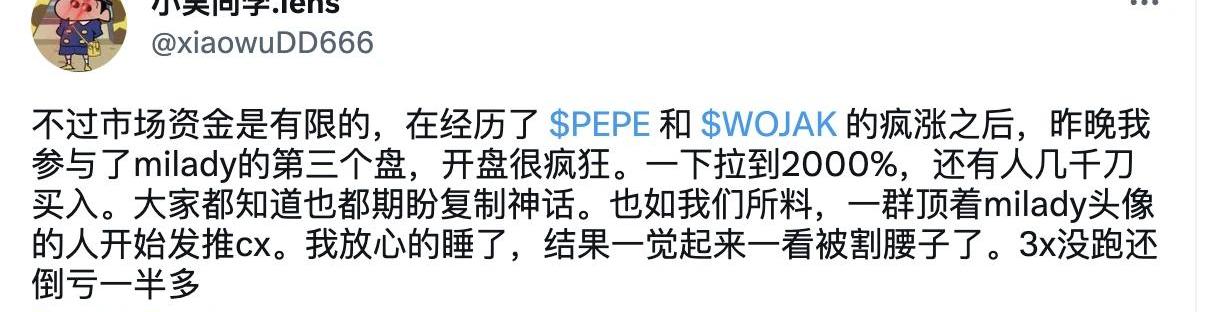 XRP/HKD-1.46%“價值投資一場空,梭哈佩佩住皇宮。”從寂寂無名到躋身市值前100,PEPE譜寫暴富神話的同時,也徹底點燃Meme行情。而深扒PEPE早期“發現者”后發現,大部分為MiladyMaker持有者。作為老牌PFP項目,Milady曾因前CEO的種族和極端主義陷入價格低谷,而后被重新價值發現。面對同質化嚴重的PFPNFT賽道,Milady靠何扭轉口碑?推動PEPE暴漲,Milady價格和銷量短期暴漲