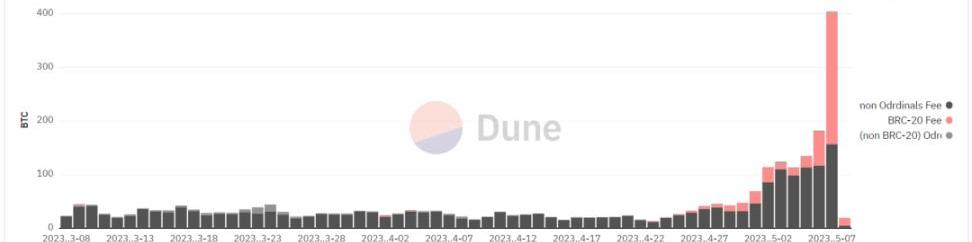 https://dune.com/cryptokoryo/brc20大量的BRC-20代幣交易產生的礦工費近日占據整個BTC網絡的接近30%,5月7日,BRC-20手續費占比達到歷史新高,驚人的61%。更高的費用對礦工收入和整體網絡安全都是有益的,但是對于需要日常使用BTC網絡的用戶來說無疑非常頭大。
