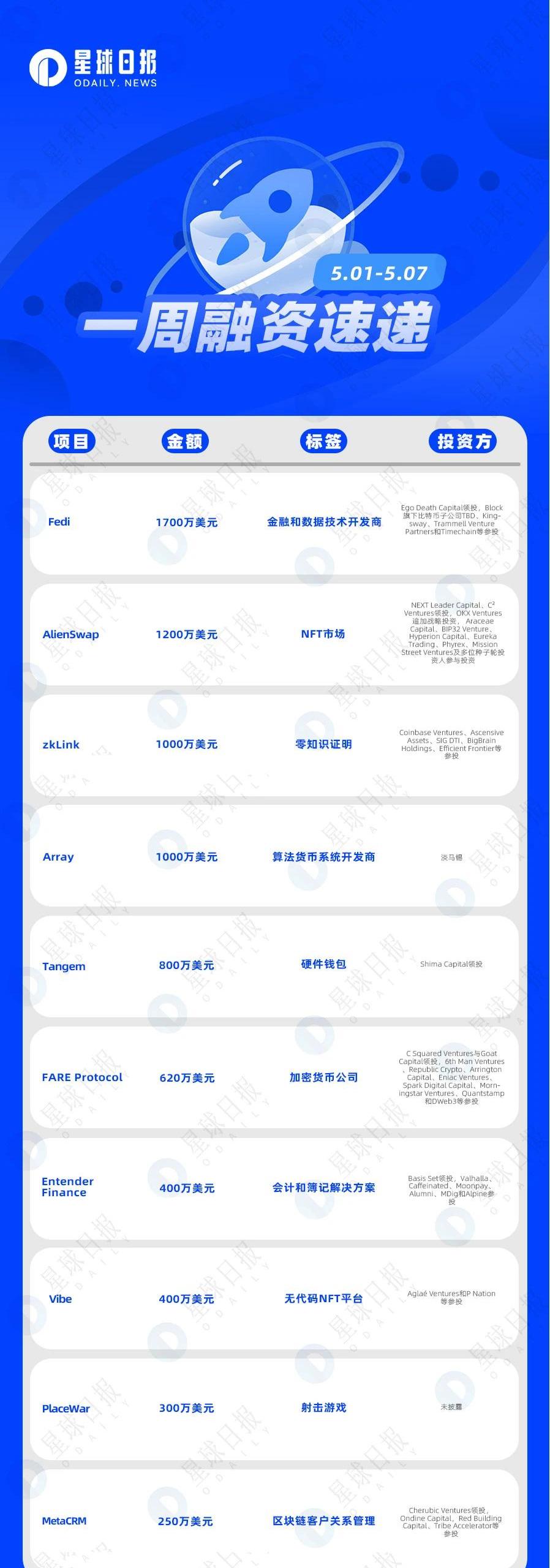 金融和數據技術開發商Fedi完成1700萬美元A輪融資,EgoDeathCapital領投5月4日,據官方消息,金融和數據技術開發商Fedi完成1700萬美元A輪融資,EgoDeathCapital領投,Block旗下比特幣子公司TBD、Kingsway、TrammellVenturePartners和Timechain等參投,這筆資金使Fedi的總融資額達到2121萬美元。據悉,Fedi利用比特幣托管開源協議Fedimints,使開發人員可以輕松構建其他應用程序和模塊,Fedi的社區或“第二方”托管模型為第三方加密貨幣交易所、云備份服務和加密消息應用程序提供了一種安全的替代方案。該公司將于本月晚些時候針對構建者社區預發布其聯合操作系統的Alpha版本。NFT市場和聚合交易平臺AlienSwap完成1200萬美元融資,NEXTLeaderCapital、C2Ventures領投5月4日,NFT市場和聚合交易平臺AlienSwap完成1200萬美金戰略融資,NEXTLeaderCapital、C2Ventures領投,OKXVentures追加戰略投資,AraceaeCapital、BIP32Venture、HyperionCapital、EurekaTrading、Phyrex、MissionStreetVentures及多位種子輪投資人參與投資。據悉,AlienSwap即將在未來一周發布AlienSwapPro并推出NFT太空競賽空投,太空競賽空投獎勵將為第1輪空投的2-5倍。新的融資將用于擴大AlienSwap的工程團隊,開發創新的NFT流動性工具和交易產品,并加大NFT基礎設施投入,打造領先的NFT交易基礎設施。多鏈統一交易基礎設施zkLink完成1000萬美元融資,CoinbaseVentures等參投5月4日,基于零知識證明的多鏈統一交易基礎設施zkLink宣布完成1000萬美元融資,CoinbaseVentures、AscensiveAssets、SIGDTI、BigBrainHoldings、EfficientFrontier等參投。zkLink是一個跨鏈基礎設施層,可以使用戶更輕松地跨區塊鏈交易資產,本輪籌款將有助于推動zkLink在第三季度推出其主網。基于AI的算法貨幣系統開發商Array獲淡馬錫1000萬美元投資5月1日,基于智能合約與AI的算法貨幣系統開發商Array以超1億美元估值獲淡馬錫1000萬美元投資。據悉,Array的智能合約平臺ArrayFi旨在實現基于其網絡之上并由其專有AI算法ArrayGo驅動的去中心化應用程序。該系統預計將具有各種用例,包括支付,匯款以及投資。硬件錢包制造商Tangem完成800萬美元融資,ShimaCapital領投5月3日,硬件錢包解決方案提供商Tangem完成800萬美元融資,ShimaCapital領投。此輪融資資金將用于擴大其產品范圍。據此前報道,加密貨幣智能卡生產商Tangem在2019年1月完成1500萬美元種子輪融資,投資方為SBIHoldings全資擁有的數字資產風險投資機構SBICryptoInvestment。FAREProtocol完成620萬美元融資,CSquaredVentures與GoatCapital領投5月1日,加密貨幣公司FAREProtocol完成620萬美元種子輪融資,CSquaredVentures與GoatCapital領投,6thManVentures、RepublicCrypto、ArringtonCapital、EniacVentures、SparkDigitalCapital、MorningstarVentures、Quantstamp和DWeb3等參投。Web3會計和簿記解決方案提供商EntenderFinance完成400萬美元種子輪融資,BasisSet領投5月2日,總部位于紐約的Web3自動化端到端會計和簿記解決方案提供商EntenderFinance宣布完成400萬美元種子輪融資,BasisSet領投,Valhalla、Caffeinated、Moonpay、Alumni、MDig和Alpine參投。EntenderFinance平臺支持多個區塊鏈,并且能與不同的會計平臺和Web3應用程序集成且可定制,適用于任何有意將區塊鏈交易引入其生態系統的企業,其客戶包括Hedgey、Lava、Anima等。無代碼NFT平臺Vibe完成400萬美元融資,Alchemy風險投資部門參投5月4日,無代碼NFT平臺Vibe宣布完成400萬美元融資,Alchemy風險投資部門AglaéVentures和K-Pop藝術家Psy的音樂品牌PNation等參投。Vibe旨在增加NFT的價值,使其超越其稀缺性,并實施或增加NFT的實用性。無代碼平臺讓創意人員將NFT轉化為應用程序和產品,讓NFT進化并提供現實世界和數字實用程序,可嵌入的功能包括忠誠度積分、票務和實物兌換機會。VibeNFT可以部署在任何鏈上并橋接到任何其他鏈。鏈游PlaceWar完成300萬美元戰略融資,將開啟品牌重塑計劃5月7日,基于BNBChain的火炮類射擊游戲PlaceWar宣布完成300萬美元戰略投資。此輪融資資金將用于發展游戲的生態、市場運作和建立新的品牌效應,開啟品牌重塑計劃。據此前報道,2021年10月,元宇宙游戲項目PlaceWar宣布完成180萬美元私募融資,ACCapital、AU21、WoodsonGame、ExnetworkCapital、IceteaLabs、IoTex、KyrosVentures、LDCapital、LucidBlueVentures、MegalaVentures、MetrixCapital、ReBlock、RoseOn、X21等參投。MetaCRM完成250萬美元種子輪融資,CherubicVentures領投5月1日,區塊鏈客戶關系管理解決方案提供商MetaCRM完成250萬美元種子輪融資,CherubicVentures領投,OndineCapital,RedBuildingCapital、TribeAccelerator等參投。MetaCRM表示,新一輪資金將用于推出新產品,加速客戶擴張和用戶增長,并更好地整合產品的多鏈數據,為品牌和用戶創造增強的區塊鏈體驗。據悉,MetaCRM連接鏈上和鏈下數據,以創建區塊鏈原生解決方案和分析工具,其中包括MetaForm,MetaDesk和MetaPanel。CosmosDEX協議Nolus完成250萬美元種子輪融資5月2日,Nolus是Cosmo上的一個可互操作協議,已獲得250萬美元的pre-seed輪和seed輪融資,Dorahacks、Everstake、CogitentVentures、TokenMetricsVentures、AutonomyCapital等參投。鏈游平臺Playcraft完成200萬美元首輪融資,即將上線Alpha測試版5月6日,NFT商業化應用鏈游平臺Playcraft已于2022年8月完成200萬美元首輪融資,Animoca與ShimaCapital領投,BigBrainholdings、Klaytn、OrginVentures、WaterdripCapital等參投。此輪融資資金主要用于平臺游戲開發。創始人Andrew表示,Playcraft將于2023年5月啟動第二輪融資,主要用于游戲持續研發、產品運營及市場宣傳等,屆時將上線測試網,8