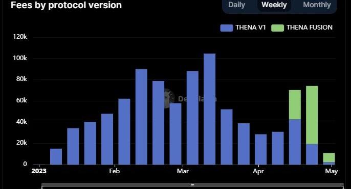 數據來源:https://defillama.com/protocol/thena與Velodrome類似,Thena平臺的流動性采購開支即The的給Pool的排放激勵,目前Thena周總排放為2,213,790個(根據官方文檔計算,初始每周排放2.6M,后續每周衰減1%),其中用于流動性激勵的排放占到67.5%,THE單價為0.33$,即用于流動性采購的激勵為1,494,308×0.33=493,121$,我們以流動性除以周流動性激勵:81,410,000/493,121=165.1$。我們可以粗暴地理解為:Thena當時每周通過1$的激勵支出可以維持價值165.1$的流動性。b.交易量和交易手續費根據Defillama數據,近3個月Thena每周交易量在5000萬-2億美金之間,其中大部分時候每周交易量在5000萬-1億美金左右。