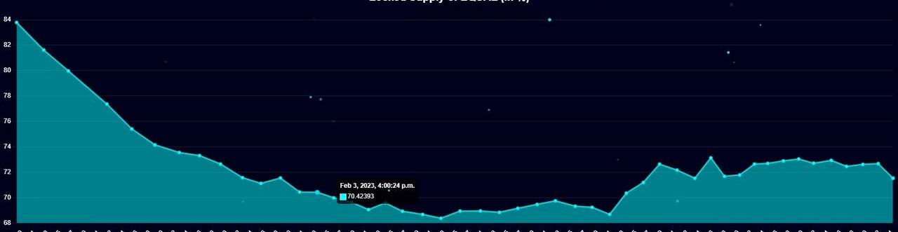 數據來源:https://dune.com/0xkhmer/velodrome-vevelo-leaderboard但在今年2-3月質押率到達峰值開始拐頭下降,盡管質押總量仍在上升,但新流通的Velo代幣質押比率明顯下降,如下表所示:目前Velo質押率距離高點81.6%已經跌去近7%,來到74.67%。