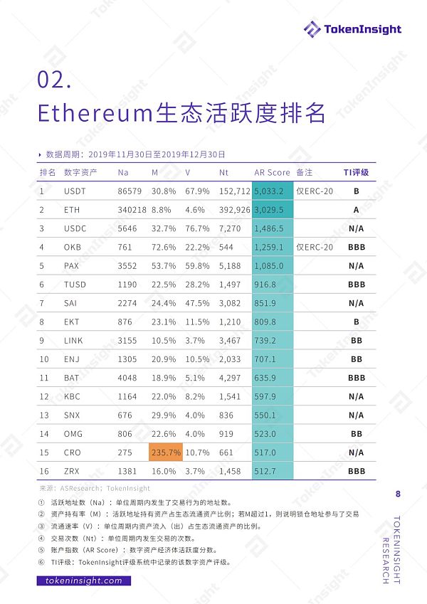 1. Ethereum平臺上生態活躍度分數較高的項目多為穩定幣。穩定幣是DeFi行業的基礎,Ethereum平臺作為DeFi生態底層的動力充足。