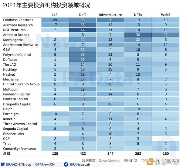 7)不同機構在投資領域中表現出了一定的差異性。比如,Coinbase Ventures投資最多的領域是Infrastructure,同樣相對更重視這一領域投資的機構則包括Digital Currency Group、Dragonfly Capital、Kenetic和Binance Labs等。而NGC Ventures、Alameda Research、Polychain Capital、Defiance、Mechanism等則專注于DeFi領域。另外,Animoca Brands則基本專注于NFTs和Web3領域。