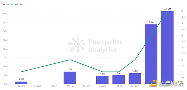 在 GameFi 的井噴式增長下,隨之而來受到關注的便是作為紐帶的游戲公會。11 月和 12 月分別獲得 3400 萬美元 和 4150 萬美元的驚人成績,其中不乏如 Andreessen Horowitz(a16z)、DeFiance Capital、Coinbase Ventures、Animoca Brands 等知名風投機構。