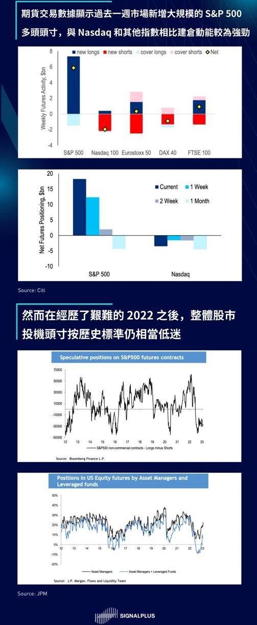 在市場頭寸方面,相較于Nasdaq的表現不佳,過去幾周投資者新增了大量的S&P500多頭頭寸,不過在歷經艱難的2022年后,整體投機頭寸與歷史數據相比仍然相當低迷。