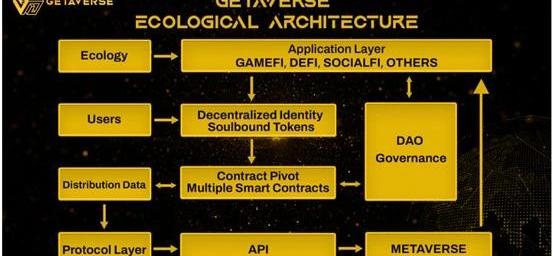 Getaverse是一個區塊鏈信用系統,在多個公共鏈上開發和部署。它旨在為數字認證系統創建一個基于Web3協議的生態元宇宙服務平臺。在Getaverse上注冊后,用戶將獲得DID身份,他們可以使用該身份建立自己的信用系統,并參與平臺的生態使用、建設和管理。用戶可以通過參與諸如擁有資產、質押挖礦、治理投票等活動來提高綜合信用評分。創新的Web3.0項目可以通過Getaverse的開放API接口訪問,包括DEX、NFT、Defi、Gamefi、Socialfi和其他生態應用程序。下圖描述了Getaverse的生態系統的架構。