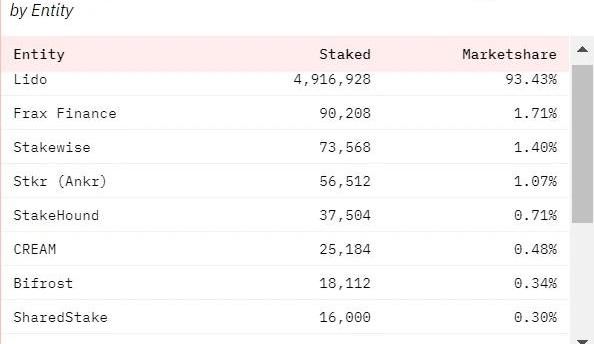ETH質押數超過5萬枚的流動性質押服務項目目前有:Lido、RocketPool、FraxFinance、Stakewise、Ankr。