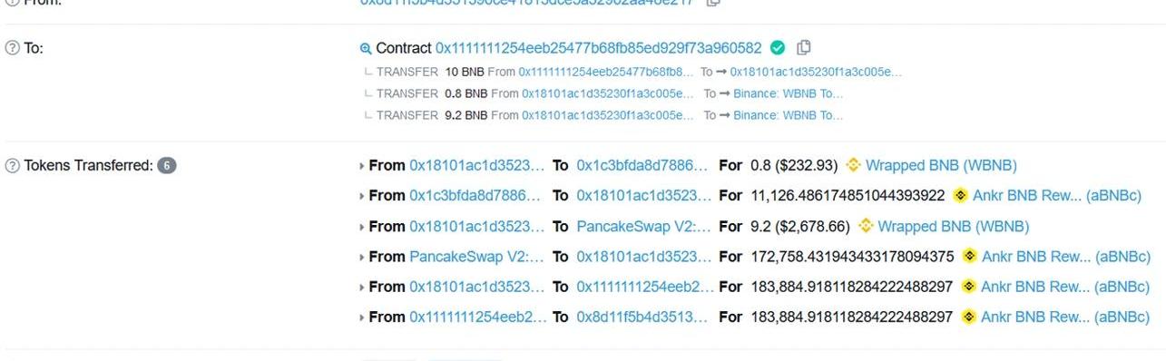 套利者在攻擊發生時,利用10個BNB在PancakeSwap上兌換了18萬枚aBNBc。