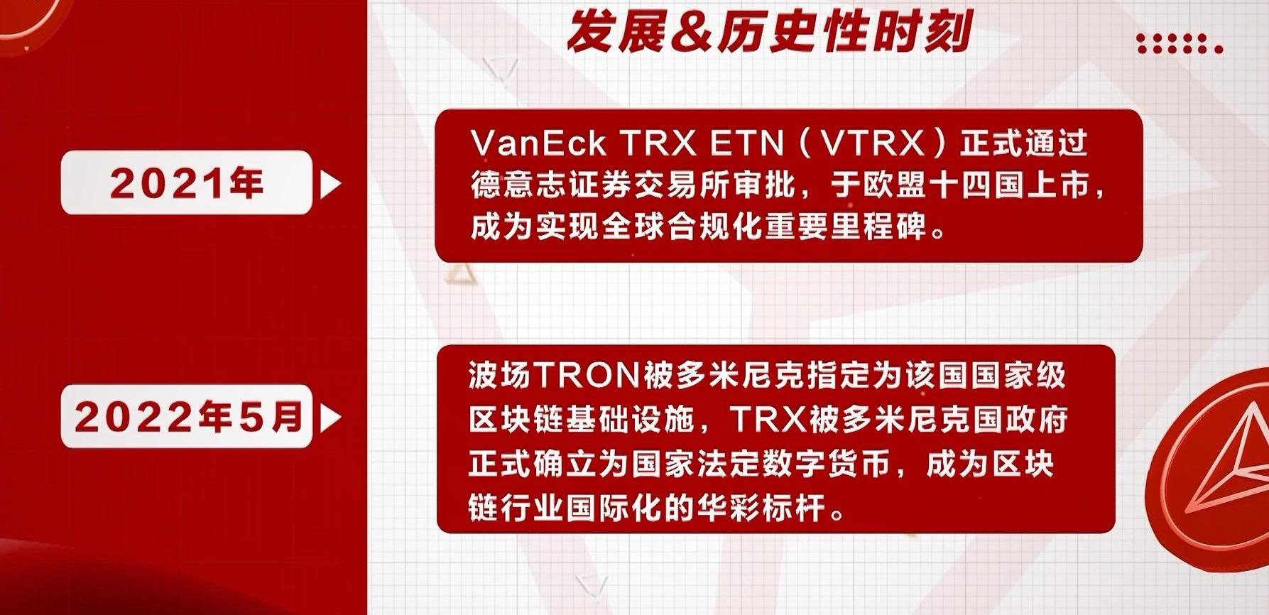 2018年9月,TRX/USD登陸美國Bittrex交易平臺,邁出國際化第一步。2019年10月,波場與三星達成戰略合作,TRX落地移動商業應用。2021年,VanEckTRXETN正式通過德意志證券交易所審批,于歐盟十四國上市,成為實現全球合規化重要里程碑。隨著今年10月份TRX被多米尼克國政府正式確立為國家法定數字貨幣,成為區塊鏈行業國際化的標志性事件,2022年波場國際化征程也迎來高潮。