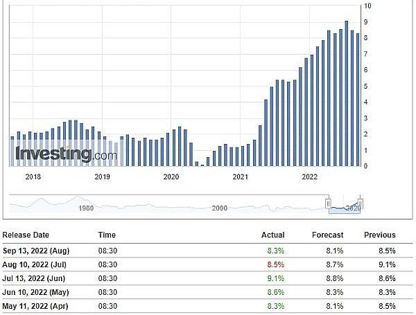 本周美股在周二盤前CPI公布后開始大跳水,納指跌幅5.16%,標普指數跌幅4.32%,幾近觸發一級熔斷。CPI公布數值為8.3%,高于預期值0.2%,高于前值0.1%,周二之前很多人包括耶倫都認為能源價格的下跌會讓CPI回落,但實際數據的釋出給了市場當頭一棒,九月份加息75個基點基本板上釘釘。具體來看,8月的居住成本、食品價格和醫療保健服務價格是導致CPI上漲的主要推手,其中,食品價格持續攀升,環比漲幅達到0.8%,同比漲幅11.4%,系1979年5月來最大的同比漲幅。另外雖然汽油價格環比下降了10%左右,但電費、天然氣環比仍有上漲,美國通脹恢復正常水平仍有很長的路要走。