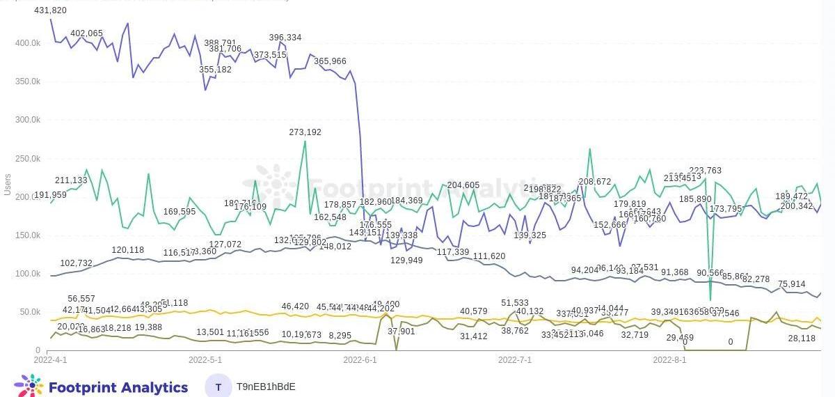 自6月以來,Splinterlands繼續與AlienWorlds并駕齊驅,因為它們的用戶群體穩步增加。相比之下,曾經充滿希望的FarmersWorld繼續呈下跌趨勢,用戶虧損嚴重。