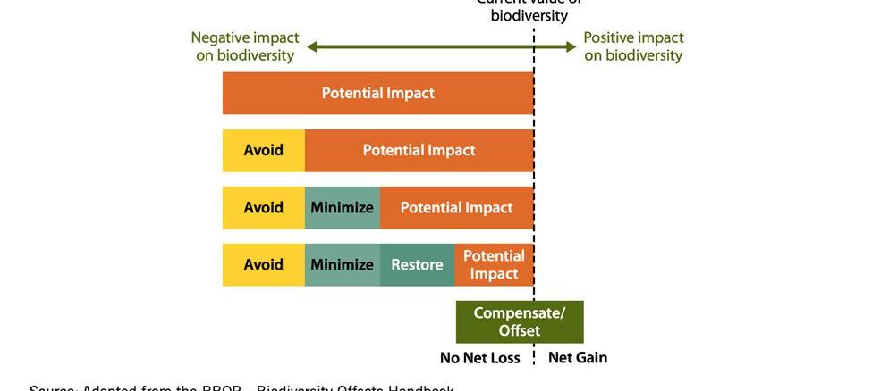 基于這些組織所做的工作,“無凈損失”政策已成為國際標準,這意味著開發商必須先采取行動避免損害生物多樣性,然后再采取“避免、最小化、恢復”的層次結構。