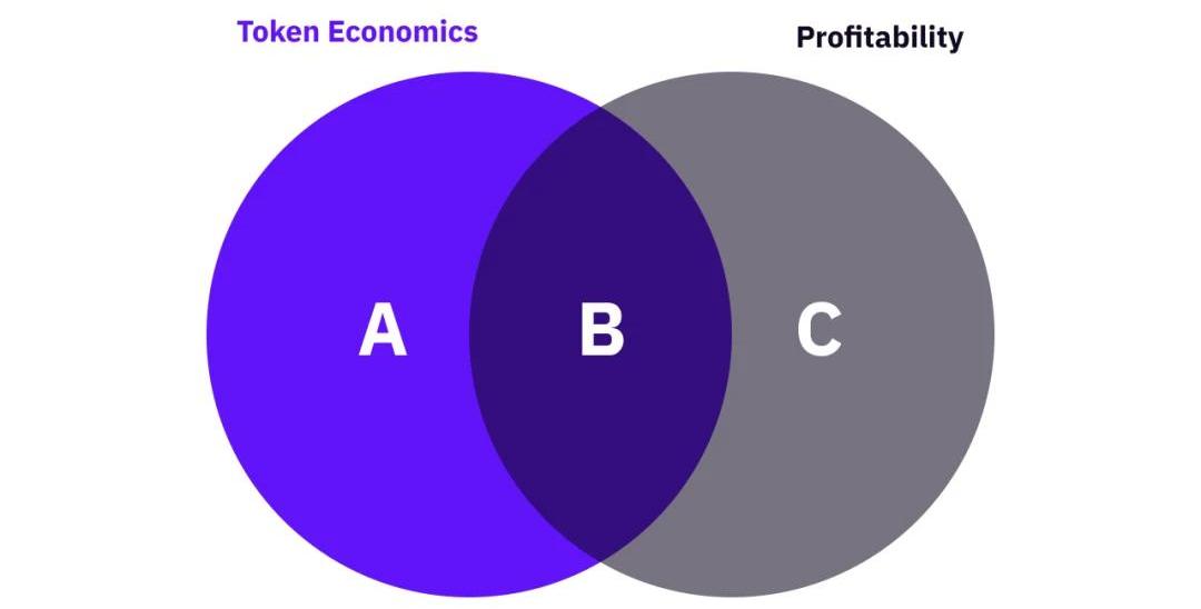 我們可以看到三個區域:純代幣經濟(A)、純盈利能力(C)和重合點(B)。以下是它們的一般含義: