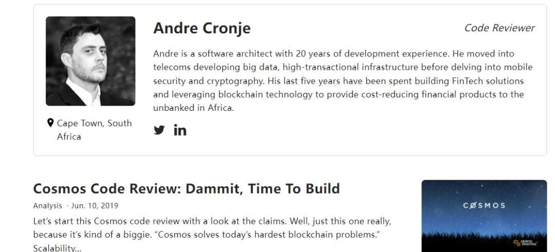 在2018年-2019年間,AndreCronje一直在Crypto平臺運營自己的專欄,相繼發表了關于Lightstreams、IRISNetwork、Arweave、Ankr、Cosmos等眾多項目的代碼分析,而他的文章也有金手指般的神話,其中很多項目都在之后的表現中大放異彩,他個人也受到了眾多粉絲的追捧。