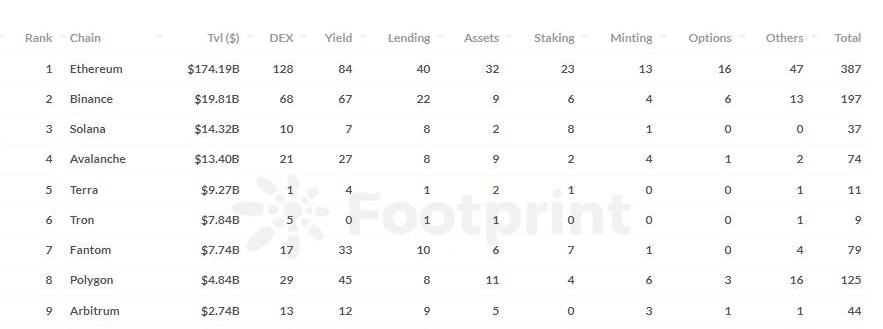 數據來源:FootprintAnalytics-TOP10公鏈DeFi項目數量