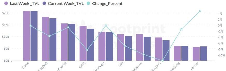 從各個協議上看,最高的TVL是Curve,本周下跌0.09%,第二是MakerDao,本周下跌3.51%。