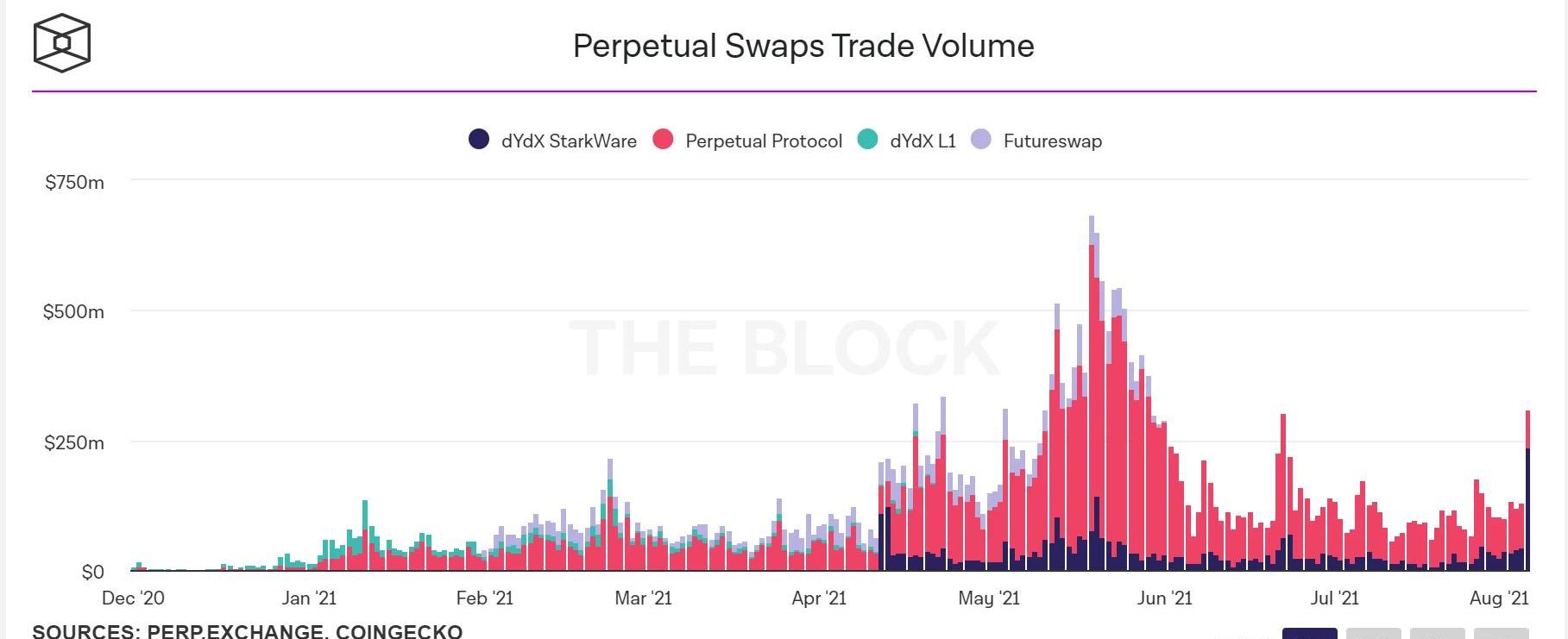 該協議的221億成交量對于中心化交易平臺來說微不足道,對于去中心化合約市場來說,PerpetualProtocol已經是獨領風騷。THEBLOCK數據顯示該協議上線不久之后,長期占領了去中心化衍生品市場80%的份額。