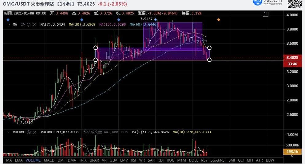 OMG或許要走出兩陽夾兩陰的形態。回顧今天開盤,觀察1H線,可以看到今早小幅拉升后,便開始一路下跌,觀察其4H線,上升渠道下OMG或許將第一次觸碰MA30線,若今天幣價能夠有效站穩MA30線,那么證明OMG的上升渠道還沒有結束。最壞的結果則是出現巨量出貨后價格閃崩,那么走勢將無法修復。今日走勢很可能將再此價位上緩慢拉升至3.64,并看后市表現選擇是否拉升。總體來看,今日幣價走勢將不會向今天早些時候更差。
